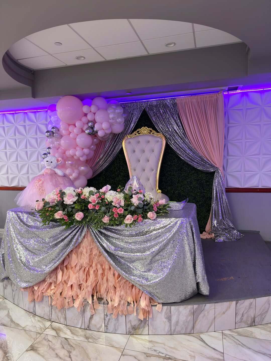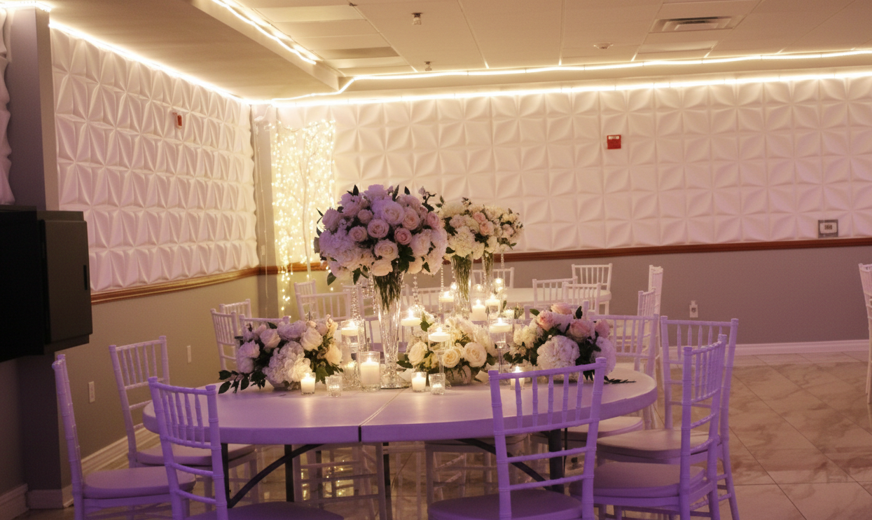 Architectural Lighting: Custom LED lighting integrated into the walls and pillars to match your event’s color theme.