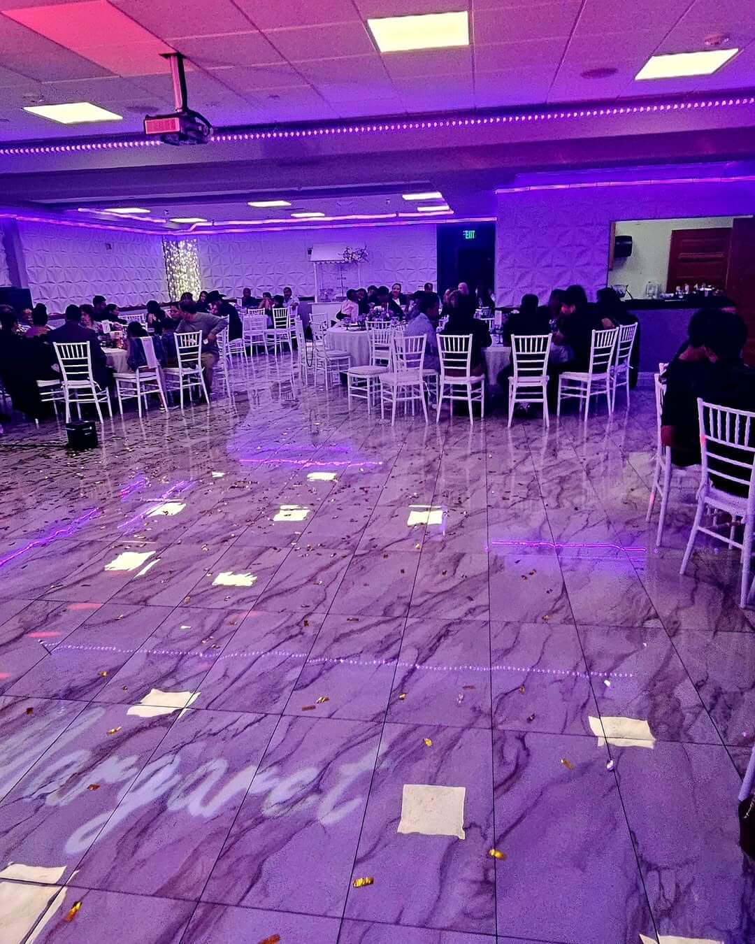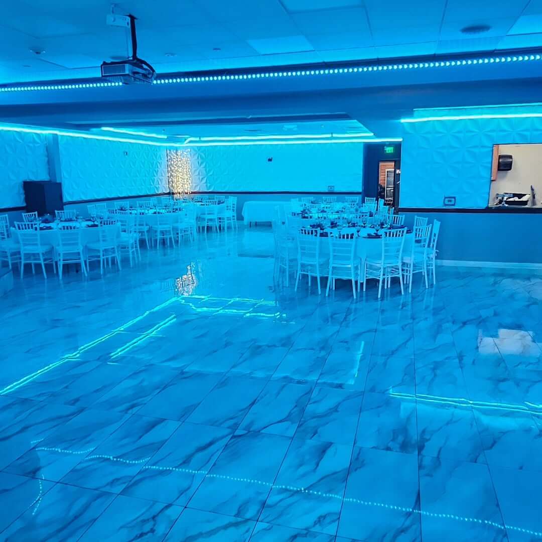 Marble-Style Flooring: High-end polished surfaces throughout the hall provide a luxury aesthetic and a perfect space for dancing.